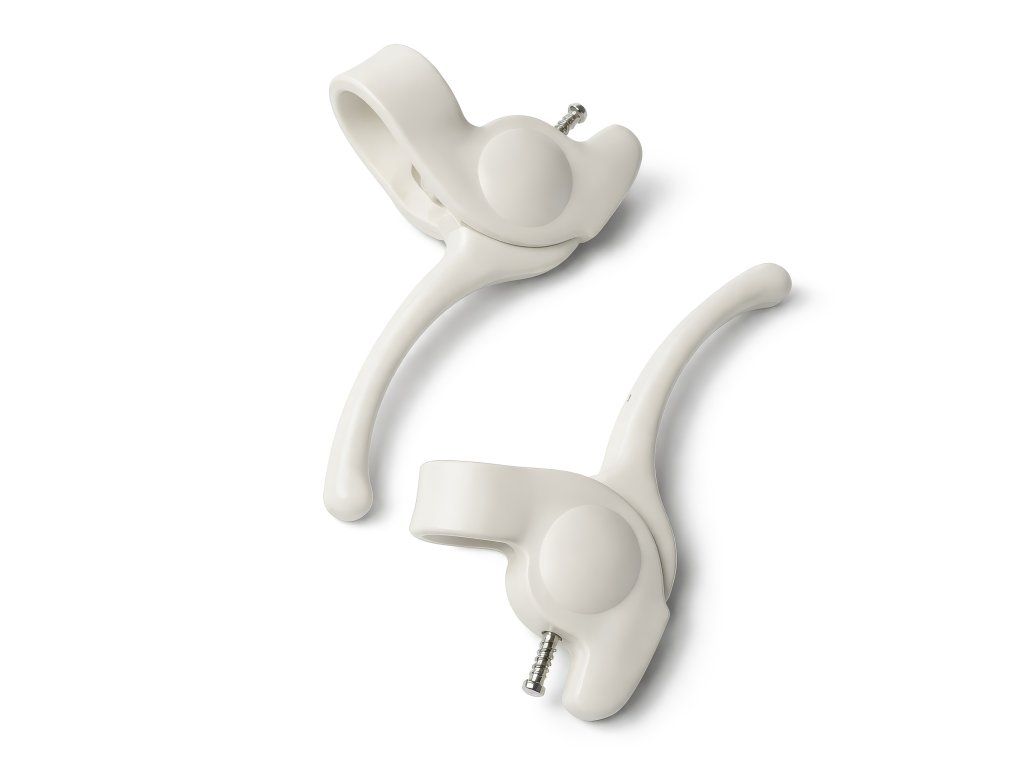 Biely dizajn pôsobí na bicykli sviežo a esteticky, pričom sa ľahko kombinuje s rôznymi farbami rámov. Dôležitou vlastnosťou je ergonómia prispôsobená menším detským rukám, čo dieťaťu umožňuje brzdiť bicykel efektívne a bez zbytočnej námahy. Vďaka baleniu v páre získate kompletné riešenie pre prednú aj zadnú brzdu.