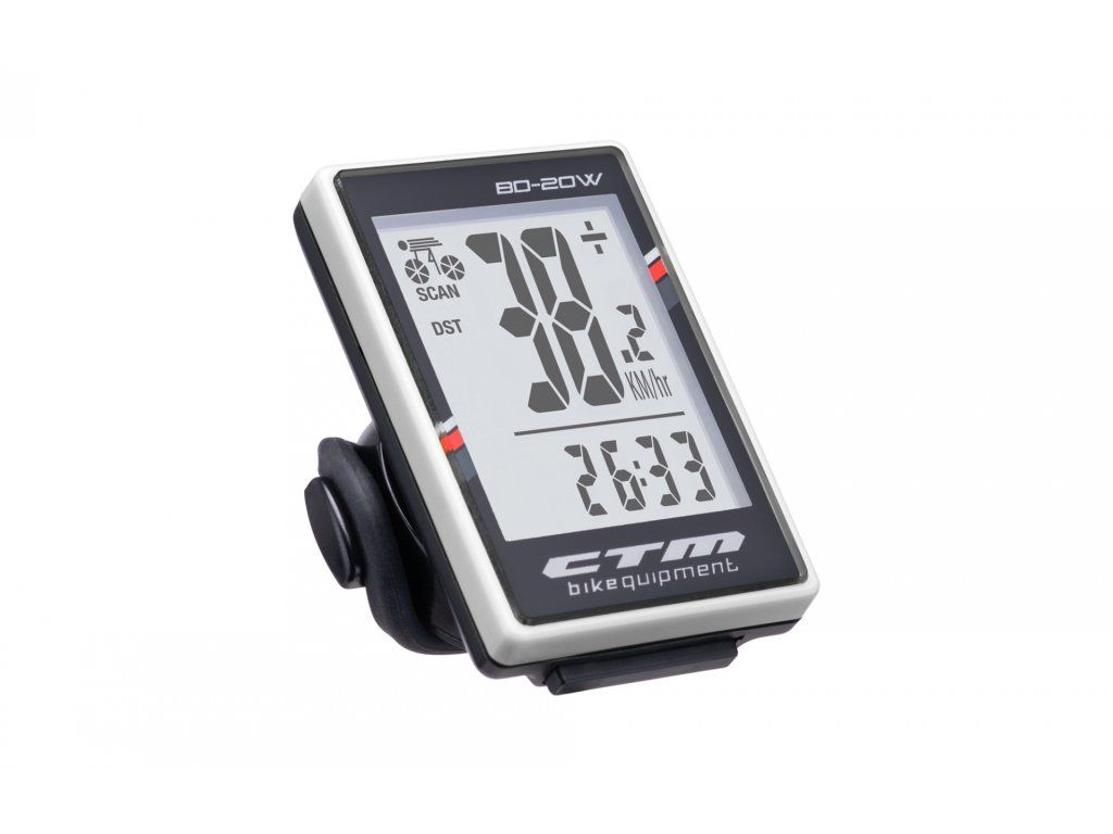 Bezdrôtový cyklopočítač CTM BD-20W je vylepšenou verziou obľúbeného modelu BD-20. Oproti drôtovej verzii prináša bezdrôtový prenos dát medzi senzorom a počítačom a novú, pohodlnejšiu montáž na silikónový pásik, ktorá umožňuje rýchle a jednoduché pripevnenie aj odstránenie počítača z riadidiel. Dvadsať funkcií pokrýva všetky dôležité parametre od rýchlosti a vzdialenosti cez čas jazdy až po sledovanie teploty a spaľovania kalórií.