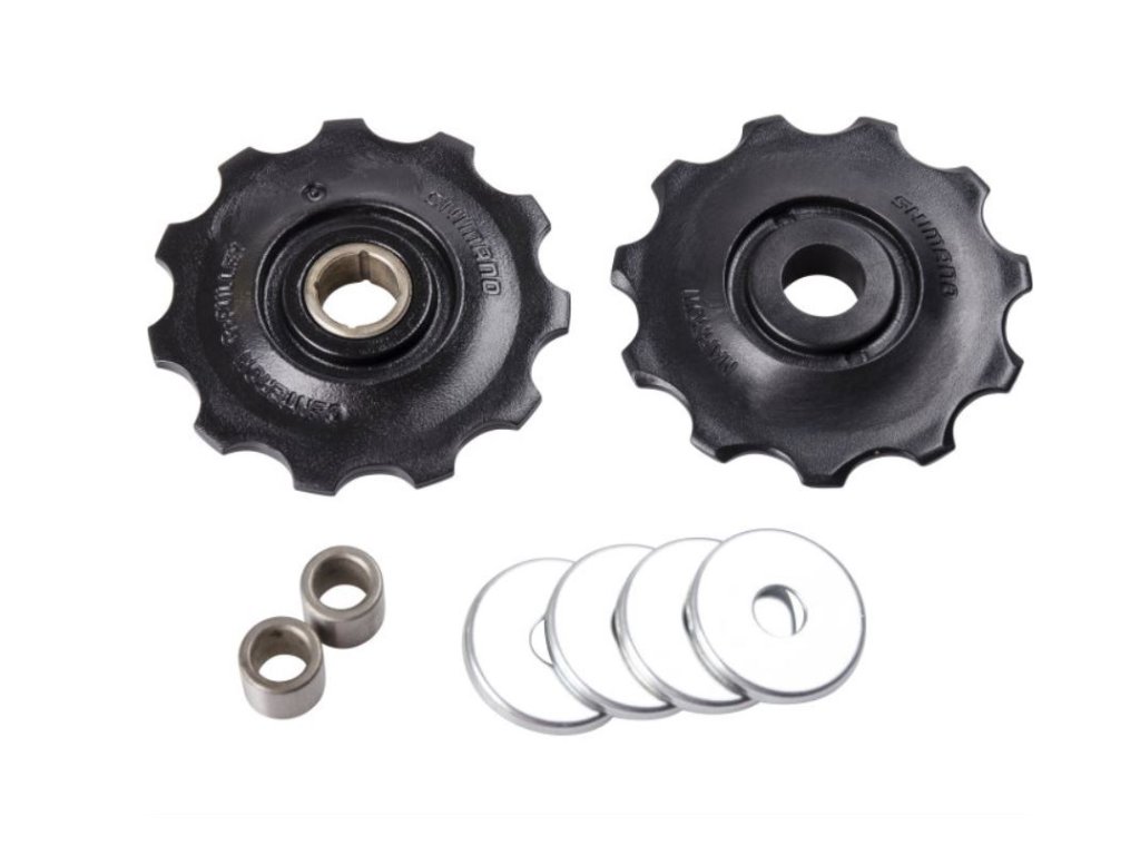 Napínacia a vodiaca kladka pre prehadzovačku Shimano Alivio RD-M430. Sada kladiek obsahuje presné ložiská, ktoré zabezpečujú nízke trenie a hladký chod.