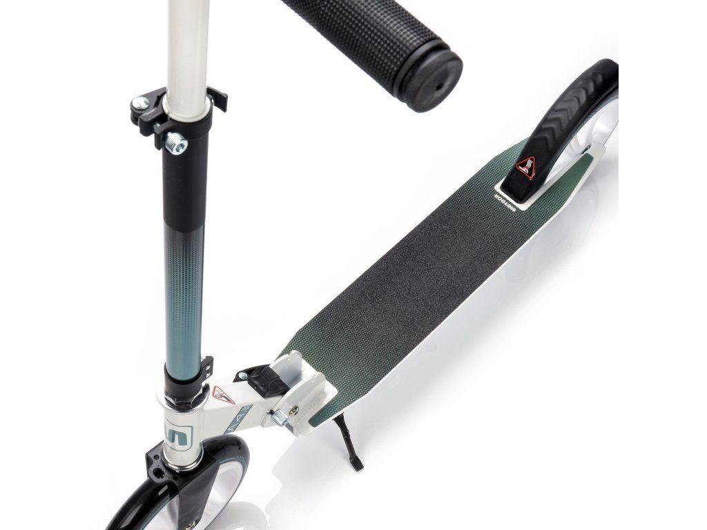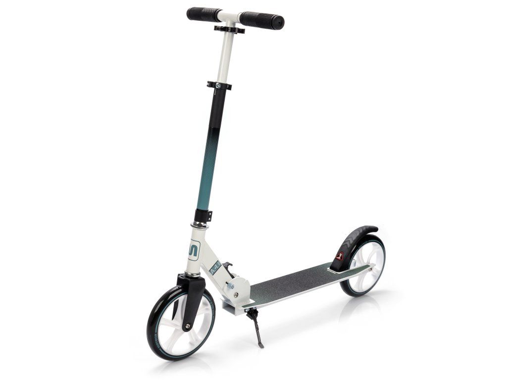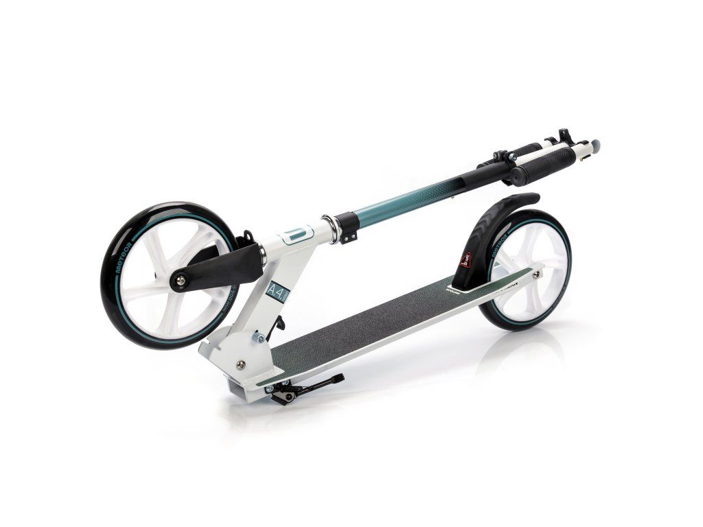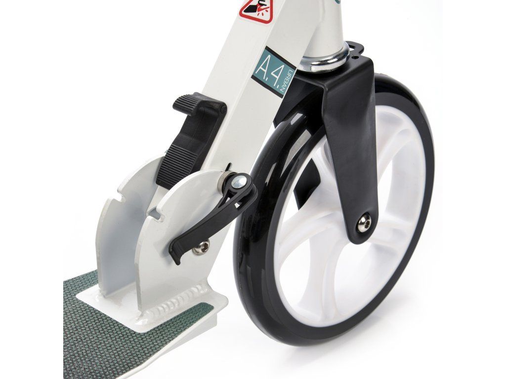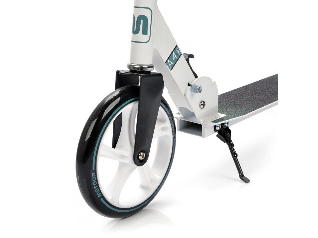 Kolobežka je vybavená veľkými PU kolesami s priemerom 200 mm a ložiskami ABEC-7.